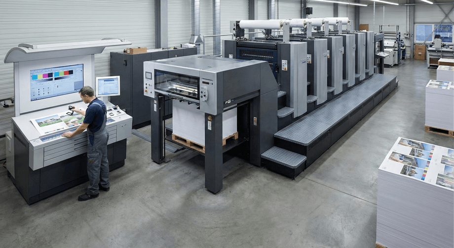 โรงพิมพ์คุณภาพจะใช้ เครื่องพิมพ์ระดับอุตสาหกรรม ที่สามารถควบคุมสี ความคม และความสม่ำเสมอได้ทุกแผ่น
